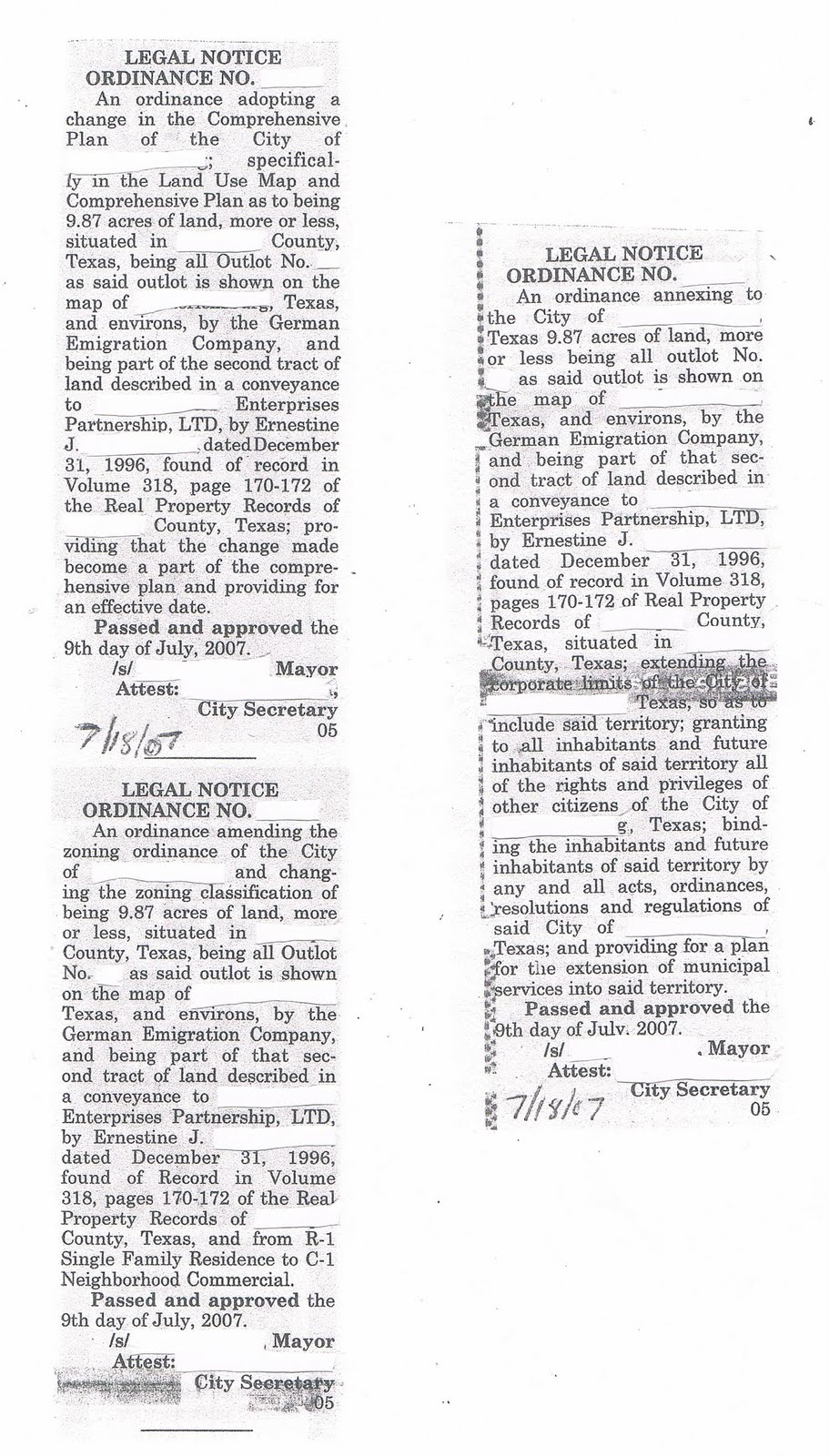 As documented here, at the same time my land was being rezoned (see "Still Waiting", posted 8/1/10), property bordering mine to the northwest was also suddenly annexed and rezoned. This other property had belonged to one of the Jimmy/James Browns discussed earlier (see "Another Jimmy Brown?", posted 6/21/10) previously. Now in these notices, it was listed as being owned by a partnership whose name was the same as Brown's mother's maiden name.